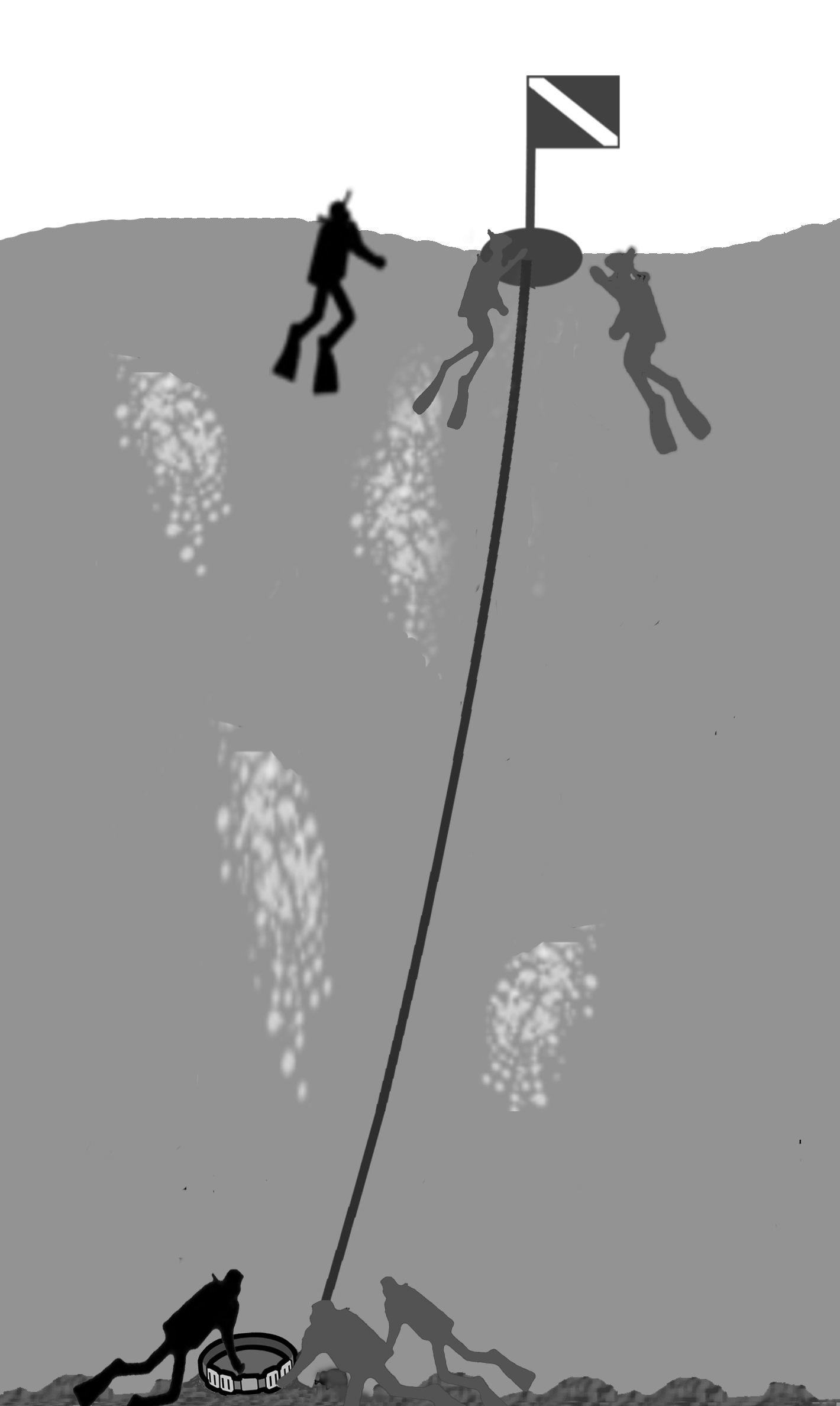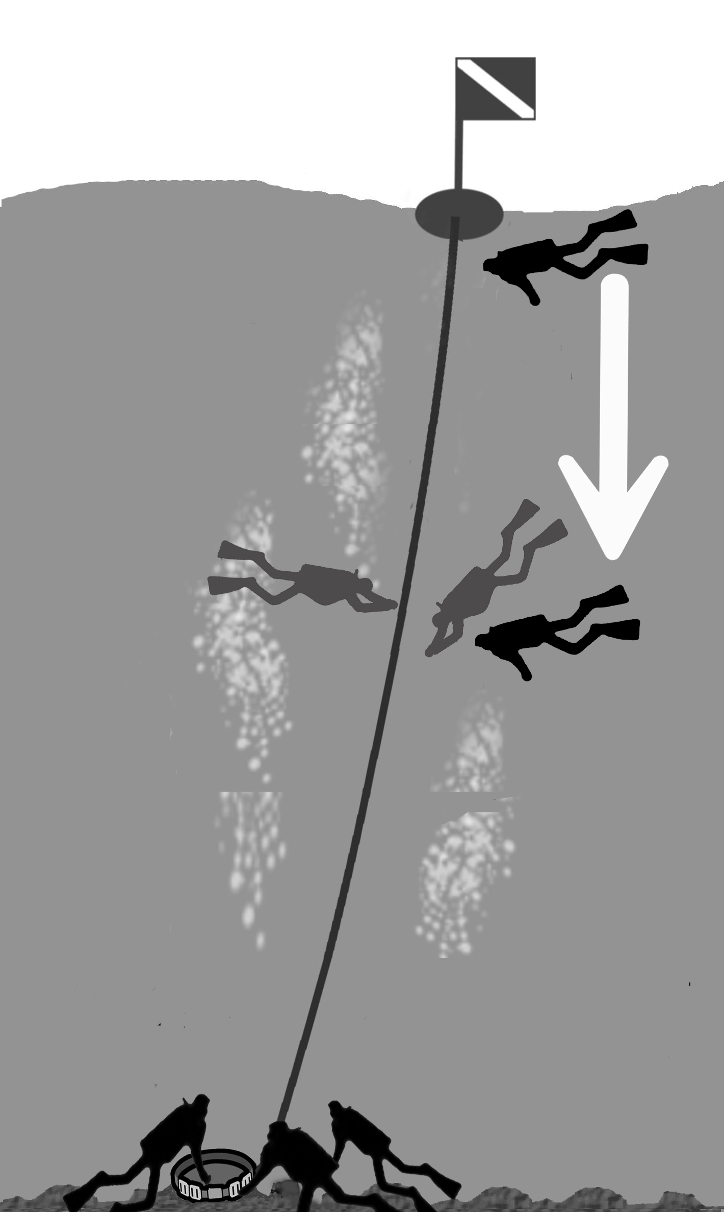 リーダーは、潜降ロープを中心とした狭い視界内で、潜降ロープに沿っているバディ1と水面フロート周りに待機するバディ2の動静確認します。