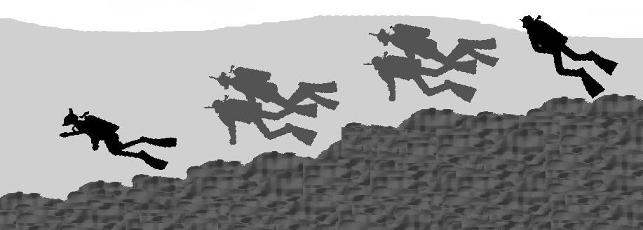 潜降ロープを中心とした狭い視界内で、潜降ロープに沿って移動するバディ2と海底のバディ1の動静確認します。