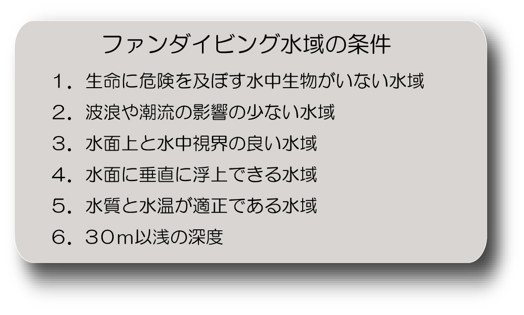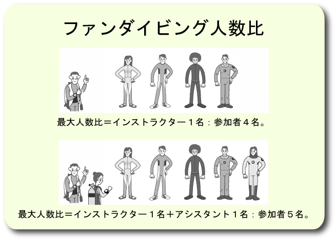 ファンダイビングの引率は、下記の条件で行いましょう。 アシスタントとは、アクティブステイタス(会員資格の維持+賠償責任保険加入)を持つダイブプロフェッショナルです。 アシスタントを2名以上用いた場合は、アシスタントが1名以上増えるたびに参加者を1名増やすことができます。 また、上記の条件に加えて、ファンダイビング参加者がその環境や状況に適した下記のコースを受講修了しているか確認する必要があります。 最大水深が12mを越えるダイビングの場合にはオープンウォーターダイバーコースを、最大水深が20mを越えるダイビングの場合にはディープダイビングスペシャリティコースを、ボートダイビングの場合にはボートダイビングスペシャリティコースを、夜間潜水の場合にはナイトダイビングスペシャリティコースを、ドライスーツを使用するダイビングの場合にはドライスーツスペシャリティコースを、ナイトロックスガスを使用するダイビングの場合にはナイトロックススペシャリティコースを、受講修了してる参加者のみを、ファンダイビングに引率することが大切です。