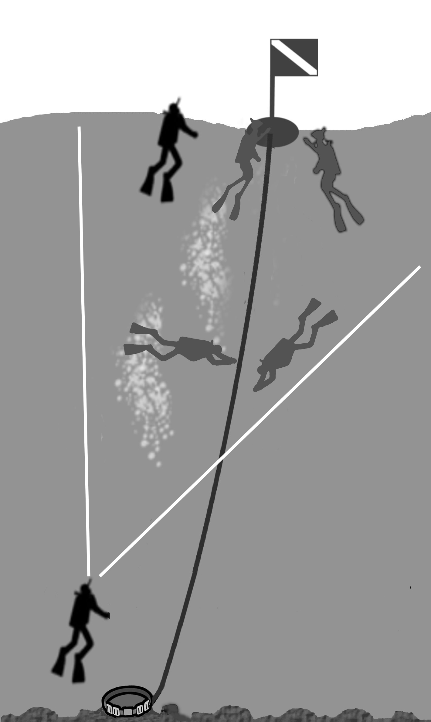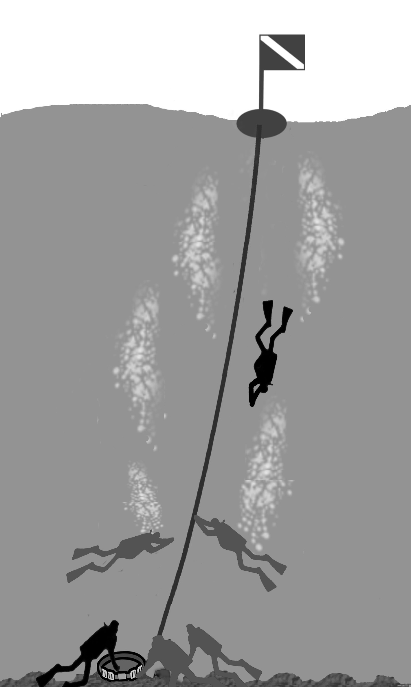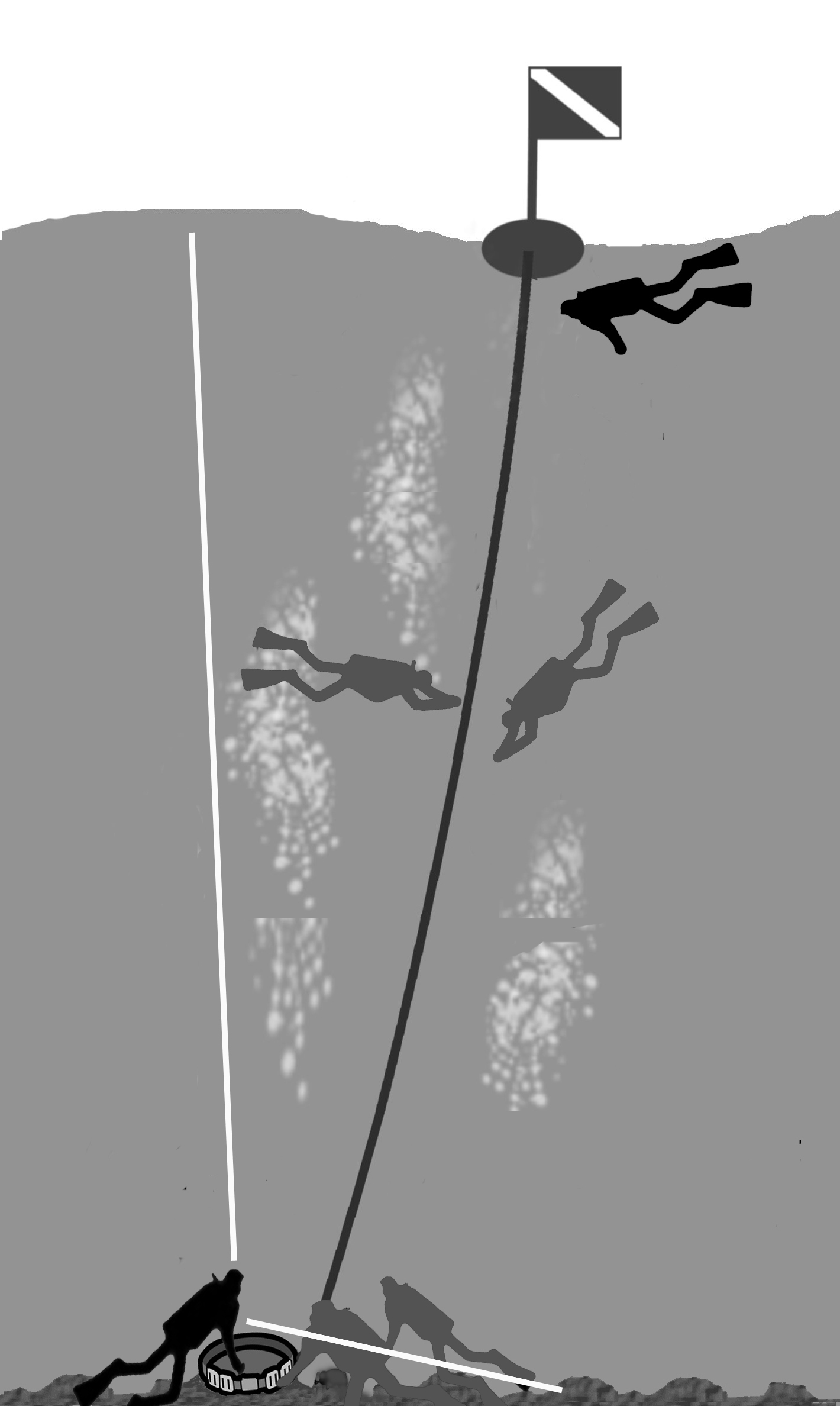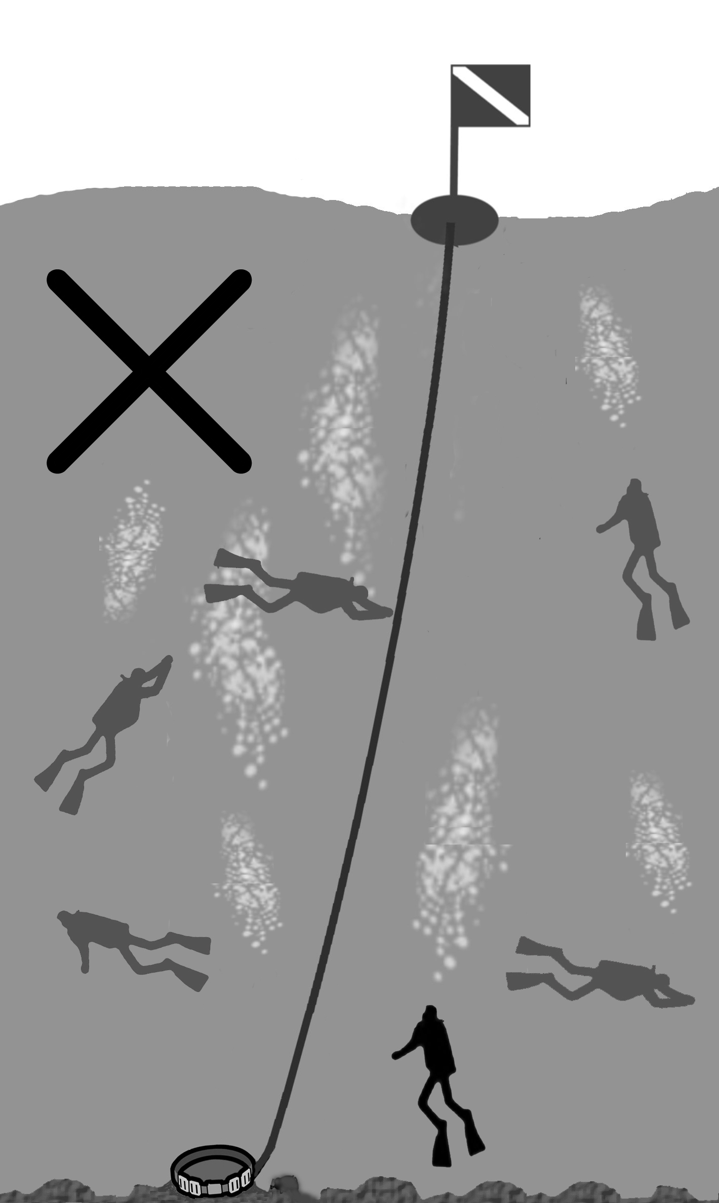 固定下潜绳于海底的沉锚(重物)周围,就是集合地点。