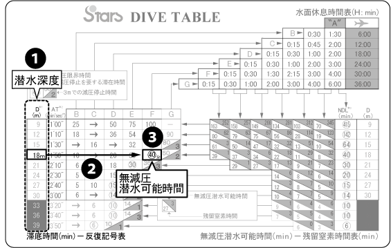 ①從潛水深度(D)查找18m。 ②由18m橫向追溯・・・ ③查找被圓圈圈起的數字。