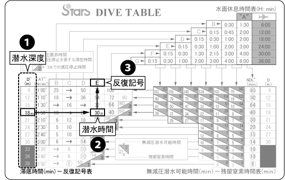 表示潛水深度18m停留30分的情況,潛水結束時有E的程度的氮氣積累在體內。(隨著拉丁字母接近G,體內聚集的氮增加下去。)
