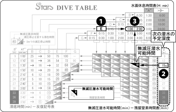 ①【表2】從水面休息時間表中查找第1潛結束時的反復記號E。 ② 從【表3】無減壓潛水可能時間-殘留氮時間表的潛水時間(D)查找下一次潛水的預計深度15m。直接橫向追溯,查找包括下面預計潛水時間35分鐘的無減壓潛水可能時間。 ③上面①的反復記號E和②的無減壓潛水可能時間51分向正上方追溯的接點是1:00到2:00之間。。