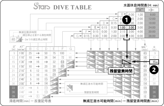 跟前頁一樣,看①和②的交差地方。 交差的地方的左下方的數字是下一次在深度15m進行潛水的情況的殘留氮時間。