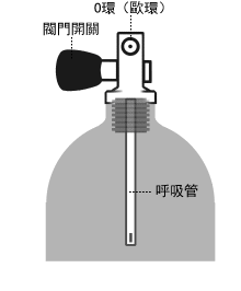 氣瓶內的空氣的出入要使用的是閥門。閥門之中有”K閥門”、帶有預備的”J閥門”,一般使用的是K閥門。J閥門是在氣瓶內的壓力在20~40氣壓的時候開始關閉,呼吸阻力會增加。根據那個情況,會知道殘壓很少,拉動拉桿手動返回到空氣的正常流動。現在因為殘壓表的普及,幾乎不被使用了。
