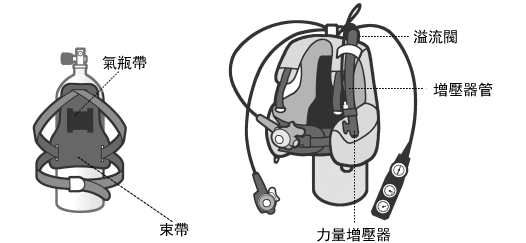 由於氣瓶的空氣進入到BC內,用空氣量調節浮力。 緊急時和水面的休息、移動時確保潛水員的浮力,在水下調節浮力可以輕鬆愉快的潛水。 為了組裝氣瓶也帶有束帶。