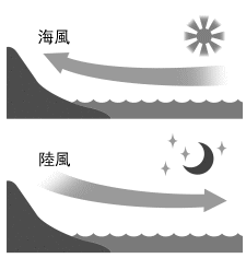 夜晚與白天相反,因為在陸地上比海上冷得快,所以會變成從陸地吹向大海的陸風。 |