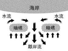 在離岸近有淺水區的地方,由於回卷浪導致海水流動,集中在淺灘的縫隙里,產生強烈的水流(離岸流)。