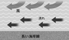 在很長的海岸線綿延的地方,由於風會產生沿著海岸線的水流。