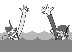 在潛水過程中走散的情況,要按照事前商量好的去做。 通常不要到處搜索,安全的上浮到水面,確保浮力,等待大家。 另外,應急的方法和救援機構和緊急聯絡人的聯絡方式也在事前查看好吧。 日常的急救箱,總是帶著一起去吧。