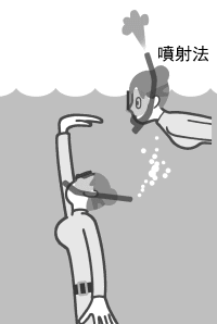 呼吸管排水是用在水面強有力的吐氣,將呼吸管內的水吹飛到外面的方法。 這個方法叫噴射法。