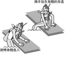 到水面的階梯少的潛水專用船或泳池等地方,最輕鬆的入水方法。 坐在水邊兩手撐在身體側面。 以兩手為軸反轉身體進入水中。 這個時候為了器材不要掛到岸邊的障礙物要將身體稍微離開岸邊進入水中。